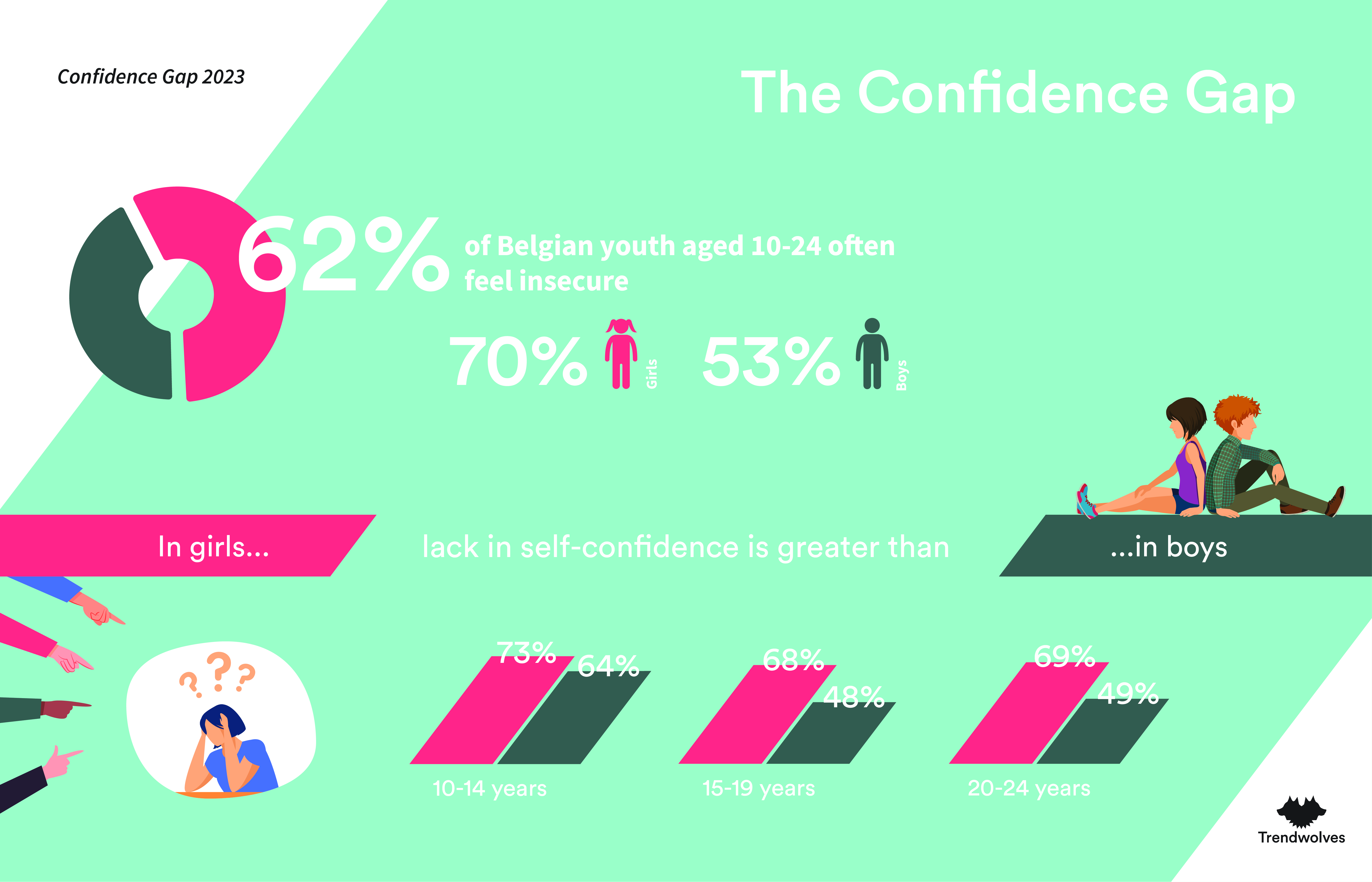 Al vanaf 10 jaar is het gebrek aan zelfvertrouwen bij meisjes aanzienlijk groter dan bij jongens. 73% van de meisjes in de leeftijdsgroep 10-14 jaar voelt zich vaak onzeker, tegenover 64% van de jongens. Het zelfvertrouwen van jongens groeit naarmate ze ouder worden, terwijl dat bij meisjes blijft schommelen.